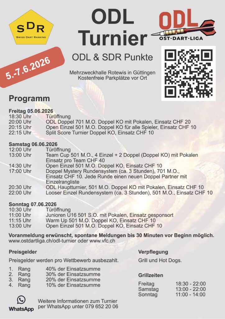 5. bis 7. Dezember 2025 | Mehrzweckanlage Rotewies, Güttingen Nach der erfolgreichen Premiere im Frühling geht die Ost Dart Liga (ODL) in die nächste Runde: Vom 5. bis 7. Dezember 2025 verwandelt sich die Mehrzweckanlage Rotewies in Güttingen erneut in das Mekka für Dartfans aus der ganzen Ostschweiz – und darüber hinaus. Eine Erfolgsgeschichte geht